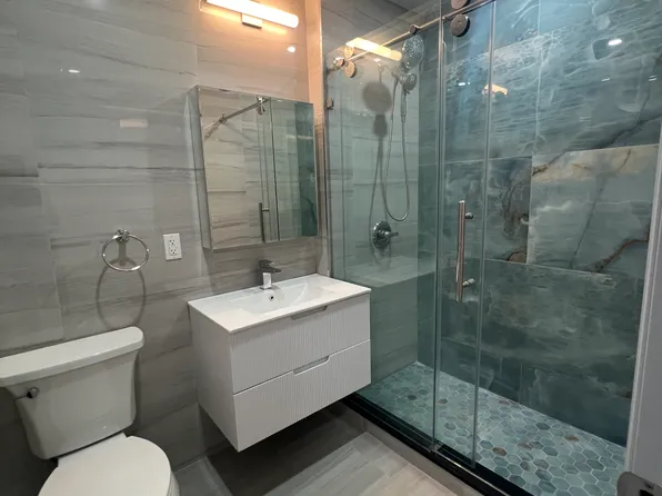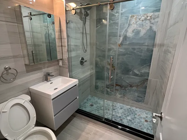 Kitchen is renovated with granite counter tops, stainless steel appliances including dishwasher. Unit has lovely windowed bathroom with marble floors and renovated fixture