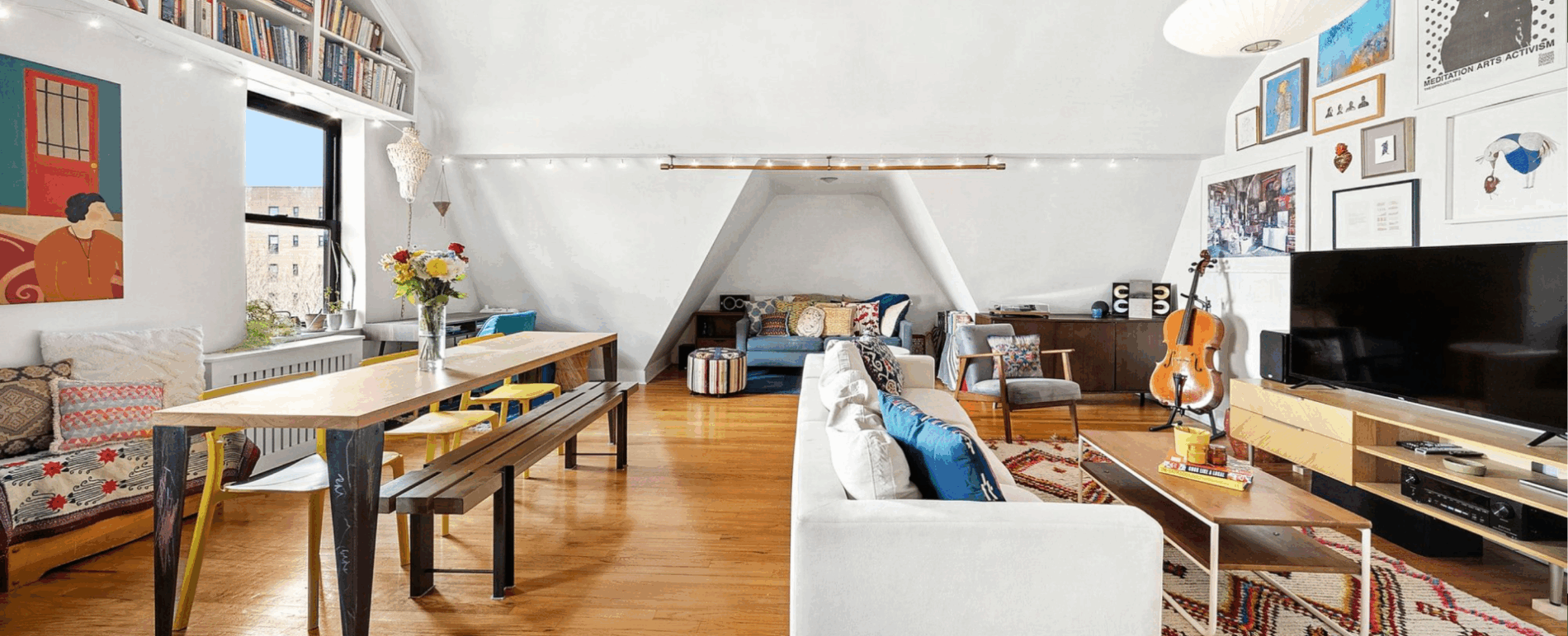 Judging by the listing photos staged with added cabinets and wardrobes, this unit does have a lack of closet space, with no formal closet in the bedroom. There’s a slightly awkward vertical pole in the bathroom (though the jute wrap used around it in the photos does help), and the building doesn’t have an elevator. But if you’re on the hunt for a Clinton Hill home on a historic street below seven figures, this one is worth shortlisting!