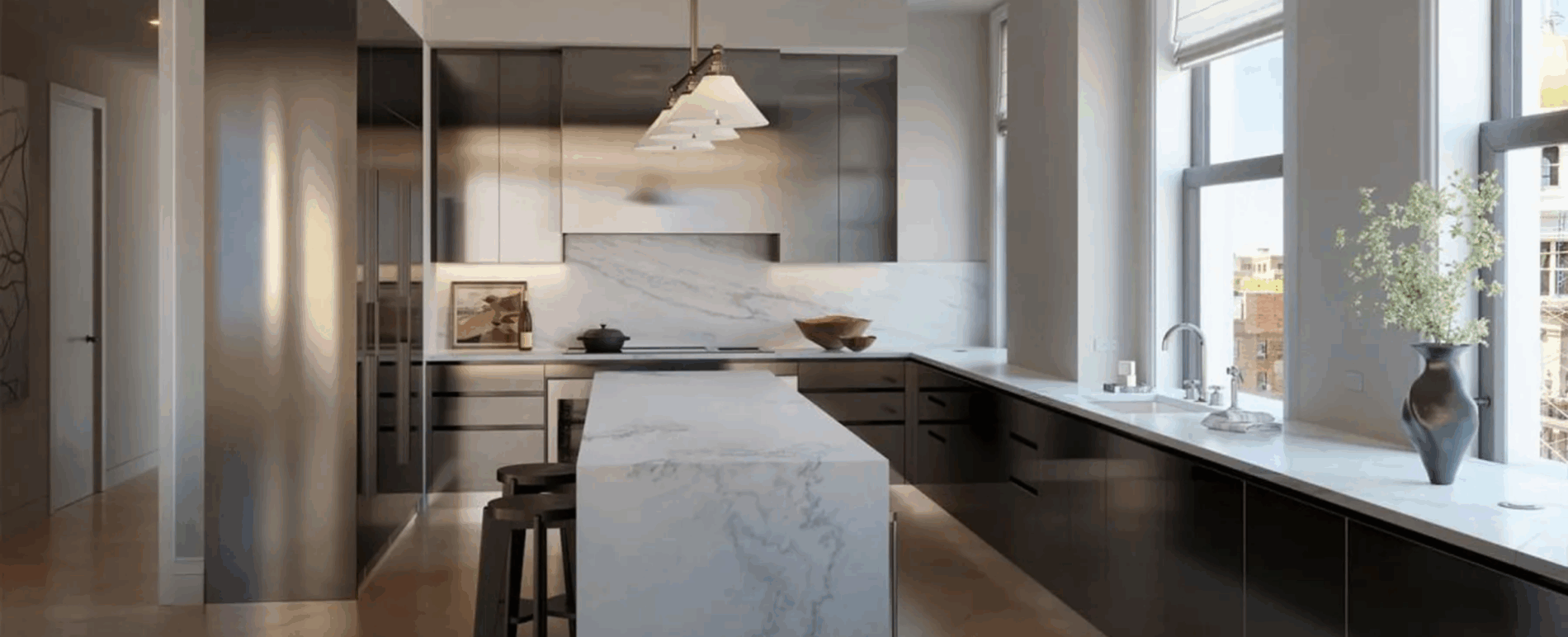 The great room also houses the kitchen, which is outfitted with a huge island and several more windows. Sleek metal cabinetry and Gaggenau appliances bring the touches of luxury one would expect in a Flatiron condo.