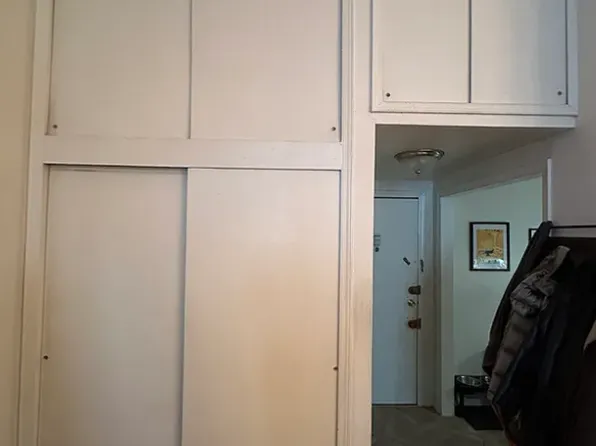 The home opens into a proper foyer with exceptional storage, including a large closet and additional overhead space — uncommon for apartments of this size.