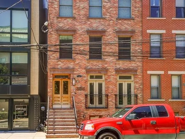 Classic Hoboken 25' wide rowhouse duplex residence offering four bedrooms, three full bathrooms, and a dedicated home office, ideally situated on the sunny, south-facing corner of 10th and Bloomfield Streets. This 2200sf expansive home is filled with natural light from triple exposures and oversized double-hung windows, complemented by soaring 10-foot ceilings with original plaster crown moldings and hardwood floors throughout.