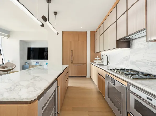 An abundance of light and unobstructed views illuminate this elegant home, boasting 10-foot, floor-to-ceiling glass windows and an extended great room perfect for entertaining. The open kitchen features high-grade stainless steel appliances, including a Sub-Zero refrigerator and a Miele double stove/oven and dishwasher.