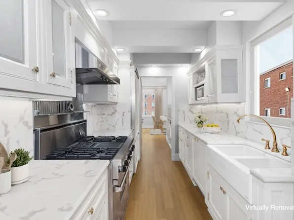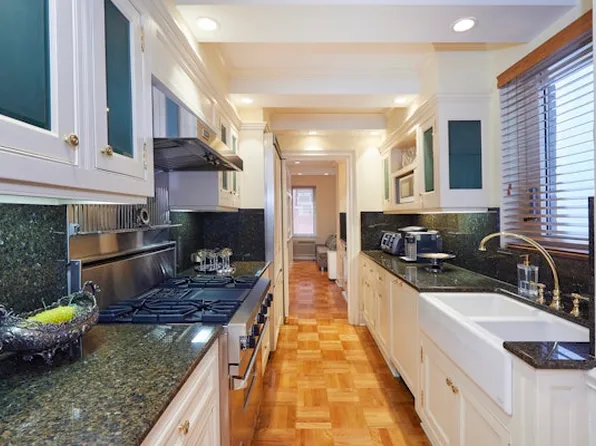 The floor plan is utter perfection in terms of grandeur and elegance. You enter through a private landing, which opens to a stately gallery with two ample coat closets and soaring nine-foot ceilings. The living/dining room is loft like and airy with the sun entering through five large windows.