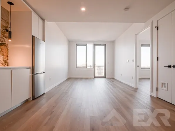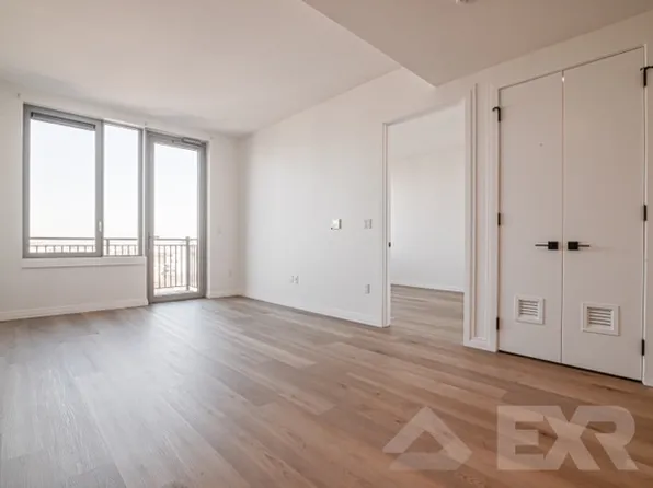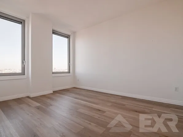 This 1 bed features a large bedroom(10×16) with high ceilings, ornate fireplace and chandelier, panoramic windows in the bedroom with views of the Manhattan skyline.