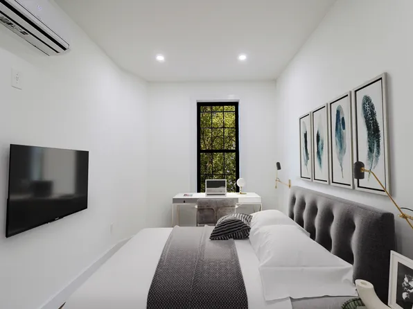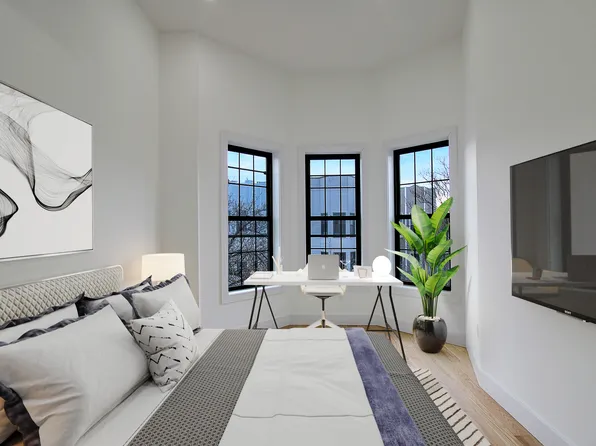 The building is clean, quiet, and well-maintained. All bedrooms can accommodate queen beds, desks, and nightstands, with great natural light and equal sizing. The gorgeous living room features exposed brick and space for a couch, TV, and coffee table.