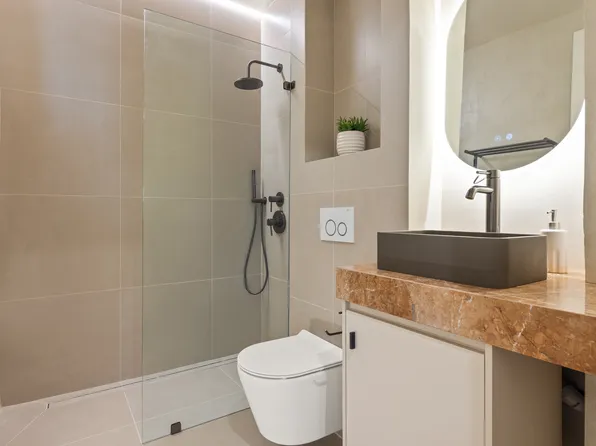 Welcome to 111 Montgomery Residence 6K, a beautifully sunlit one-bedroom, one-bathroom home featuring a flexible living space, welcoming large foyer an adorable Palm Springs inspired bath.