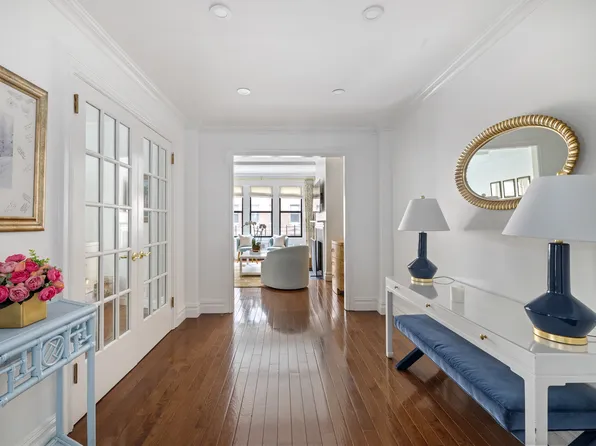 This grand six-room apartment is in a premier Carnegie Hill building. A private elevator vestibule opens onto an elegant, central gallery with two spacious walk-in closets. Off the gallery to the left, the living room and bedrooms overlook a quiet side street. The 26-foot long living room has a wall of windows, and a gorgeous marble fireplace which is surrounded by cabinetry to display art and books.