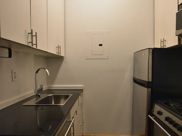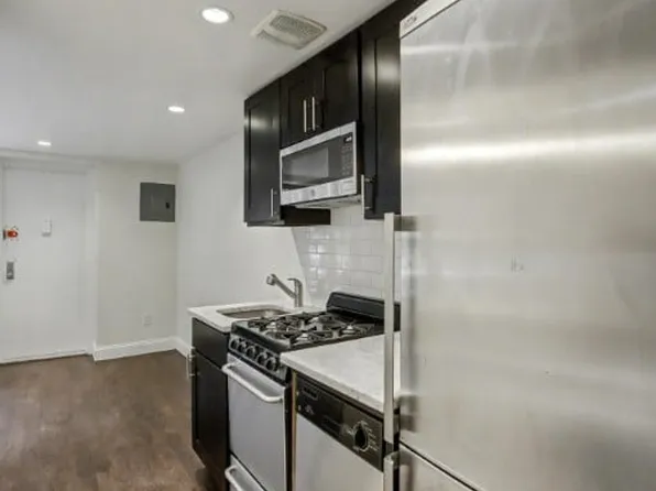 Beautiful, spacious studio now available at True North Soho. This unit features charming tree filled views of Thompson street, hardwood floors, recessed lighting, an open kitchen with breakfast bar, industrial pendant lights, tons of storage, white Caesarstone counters, and stainless steel appliances including dishwasher. The bathroom has penny tile floors, pedestal sink, Restoration Hardware vanity, tub, and glass storage shelf.
