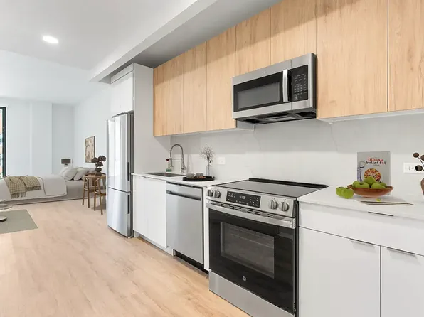 With impressive high ceilings and massive windows that fill the space with natural light, the studio features stunning wood floors throughout. The open kitchen is equipped with stainless steel appliances, sleek white cabinetry, and both heat and AC units.