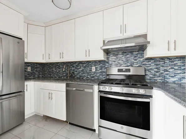 The kitchen has been fully reimagined with an open layout, marble backsplash, quartz countertops, custom cabinetry, and new stainless steel appliances.