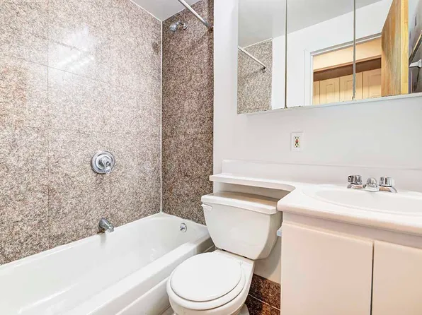 The bedroom can fit a queen bed along with a dresser or desk. The marble-tiled bathroom includes a shower/tub combo, toilet, and pedestal sink with mirrored medicine cabinet.