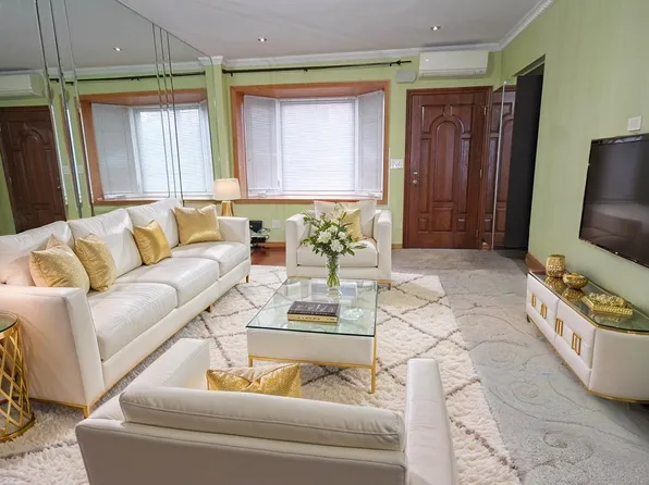 Enter inside to discover a gracious foyer opening into a spacious living and dining area, bathed in natural light through the oversized windows and a beautiful skyline.