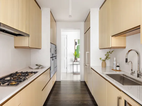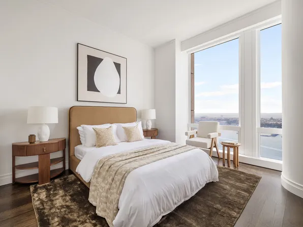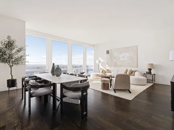 Loft Residence 68D is a spectacular 2-bedroom home spanning 2,002 square feet, with ceilings soaring up to 12-foot and breathtaking sunset views of the Hudson River. The expansive corner North & West living room, measuring over 730 square feet, features a windowed open kitchen with a striking free-standing marble island, custom oak cabinetry, and top-of-the-line Miele appliances.