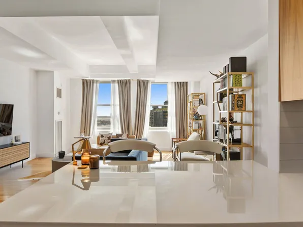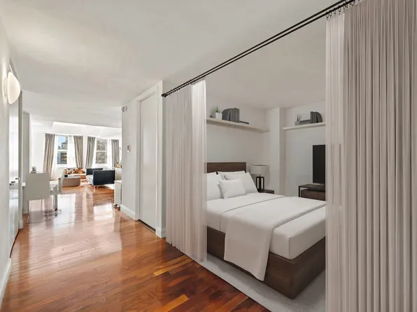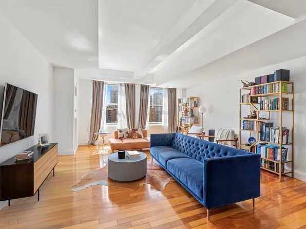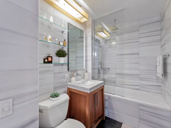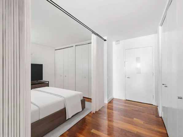 This modern designed alcove studio boasts 698 sq. ft. of living space. Light pours through the expansive double-glazed 8’2" windows with southeastern exposures, offering stunning views of downtown New York and the Harbor. The open kitchen and spacious living area give the apartment a loft-like feel. The kitchen features custom designed cabinetry and high-end appliances.