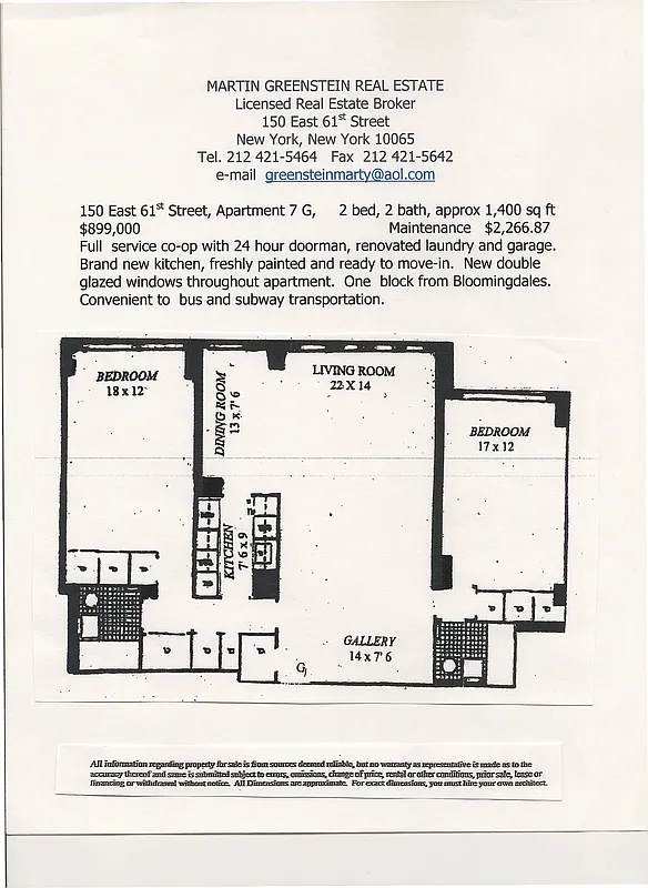Listing by Martin Greenstein Real Estate, Individual Broker, 150 East 61st Street, New York, NY 10065