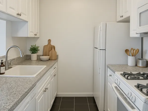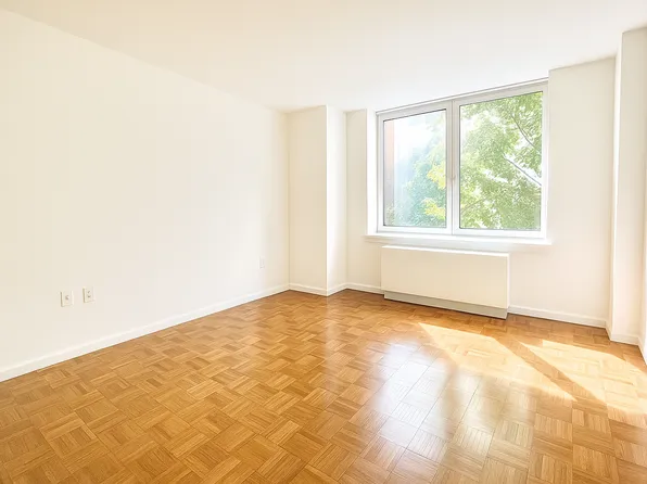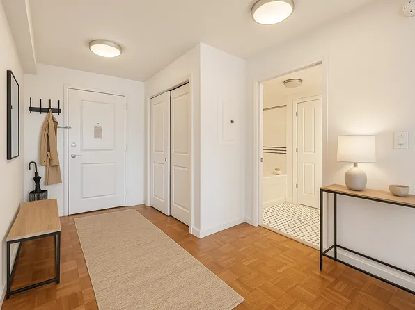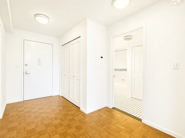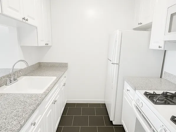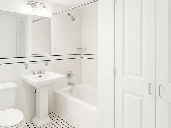 No Broker Fee! This renovated fully furnished one bedroom residence sits on an inner courtyard offering peace and tranquility in the middle of midtown Manhattan. The entry foyer leads to a separate dining area with a modern Pullman kitchen featuring white lacquered cabinetry, grey Caesar stone countertops, white marble flooring and backsplash, and all stainless-steel appliances.