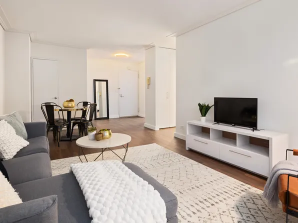 Enjoy a brand new fully furnished fully renovated very large high floor one bedroom apartment. This apartment features bright natural light, full-service luxury building with hotel-style amenities. The apartment features new wide wood floors throughout, along with a newly renovated kitchen and bathroom. The kitchen features cherry wood cabinetry and black granite counter tops, and stainless-steel appliances, including dishwasher and microwave, plus a granite island ideal for dining.