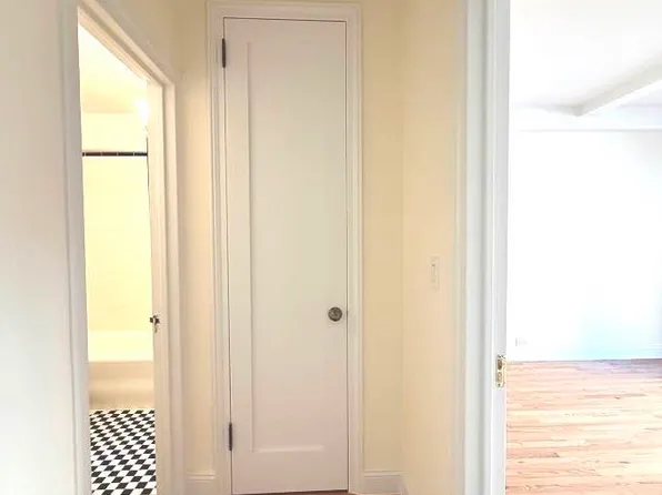 Entering the apartment there are 3 double closets with separate storage above lining the left wall. The entry gallery leads you to the open concept Kitchen, Living/Dining area. The open space features very high ceilings, 2 large windows, hardwood floors, crown molding, and a builtin entertainment/storage unit.
