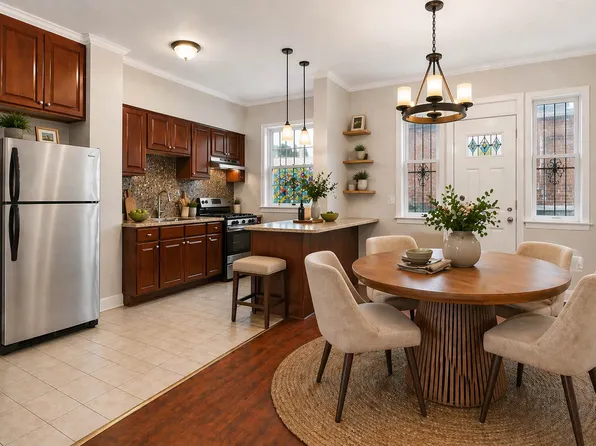 Two Family Brick Attached Town House in thriving Stuyvesant Heights Area with two bedrooms on first floor with walk in tub full bathroom, open concept kitchen with breakfast bar and stainless steel appliances, dining area, living room, access to back yard and lots of sunshine in each room, second floor has three bedrooms, separate living area, kitchen and full bathroom, and basement is finished with...