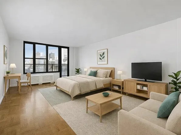 Large, bright, alcove studio/junior one bedroom with partial wall, features unobstructed Chrysler Building and City views and recently updated kitchen and bath. The apartment is Pin drop quiet in the back of the building. Spacious living area with large windows facing north. The kitchen features stainless steel appliances and includes a dishwasher.