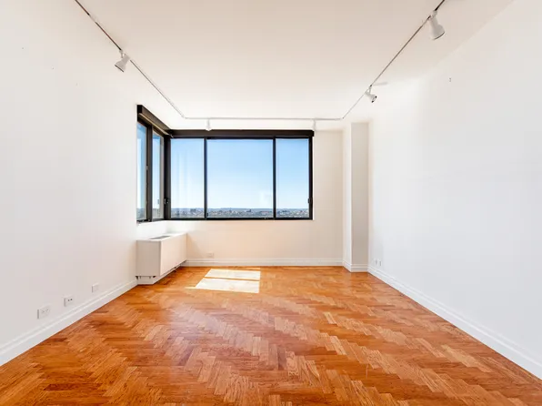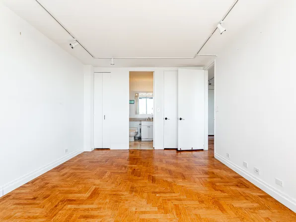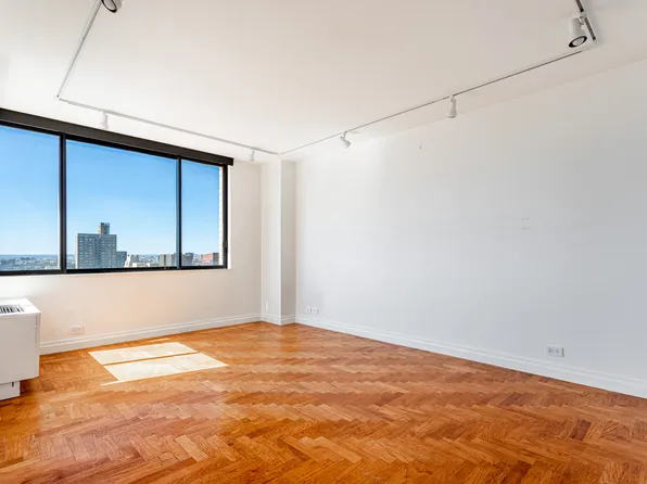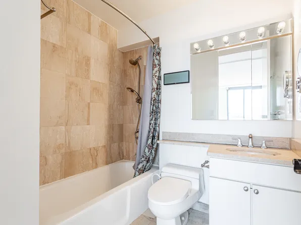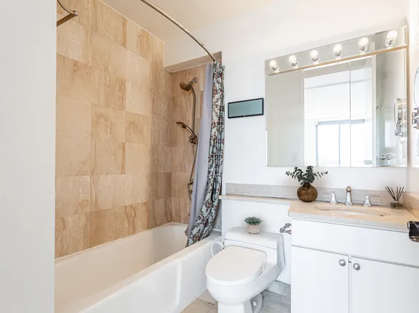 A welcoming foyer opens to a sun-filled, south-facing living and dining room with oversized windows and access to a private balcony with open city views. The windowed kitchen showcases northern city views and has stainless-steel appliances.