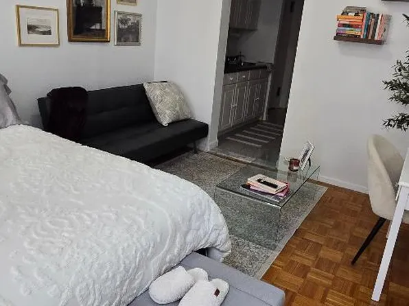Discover this large, bright, and sunny studio apartment, freshly painted with new hardwood floors, high ceilings, recessed lighting, and modern cabinetry. The apartment features a stove, two spacious closets, and abundant natural light throughout the day. The immaculate granite bathroom includes a built-in storage unit for added convenience.