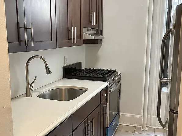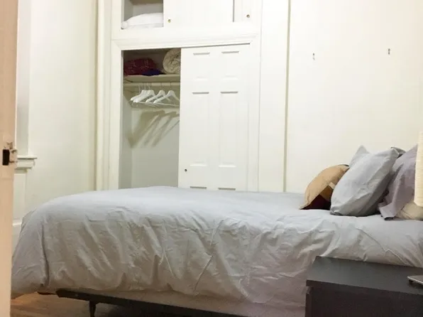 The apartment features an exposed brick wall, open kitchen ,lots of light and storage, window bathroom . This corner bedroom can accommodate a queen size bed ,dresser and a night stand.