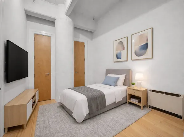 This spacious 1,371sf 1 bedroom plus home office is a classic DUMBO loft with high ceilings. An over-sized kitchen and living area offers a flexible layout with several different opportunities to configure the space. The kitchen features a custom RiFRA Italian kitchen, Miele appliances, a blackened Dornbracht faucet, porcelain stone counter tops, and a bleached white oak island.