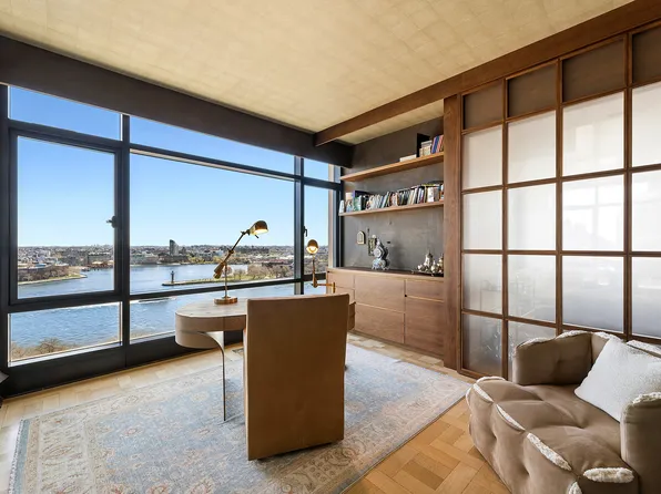 A foyer with two coat closets, a powder room, and a home office leads to a loft-like 31.