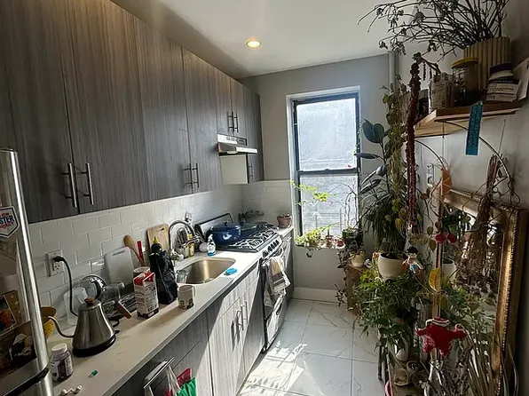 Bed-Stuy Gem with 3 bright exposures allow natural sunlight to filter in. Open configuration kitchen features: Stainless Steel appliances, Granite breakfast bar and countertops with additional storage beneath. Custom adjustable light fixtures. Hardwood floors, King sized bedroom with big double closet. Additional deep entry way closet.