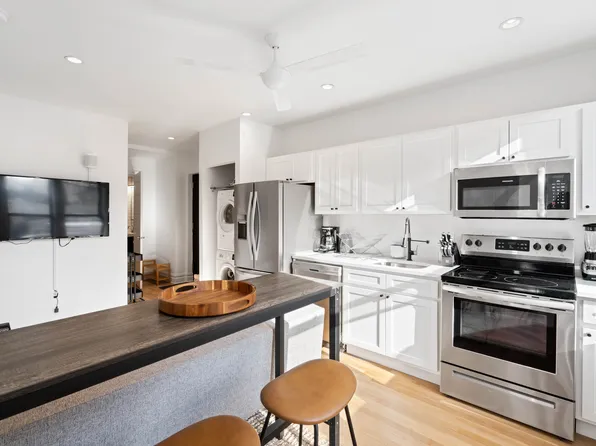 Oversized living room with exposed brick walls, updated kitchen, original hardwood floors throughout and tons of original detail.