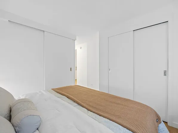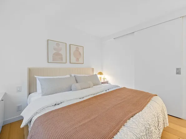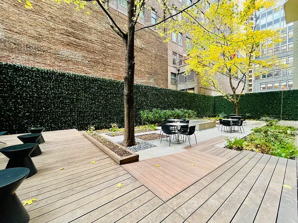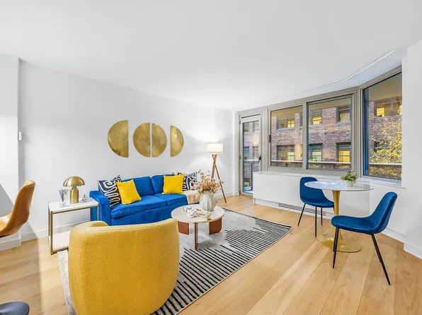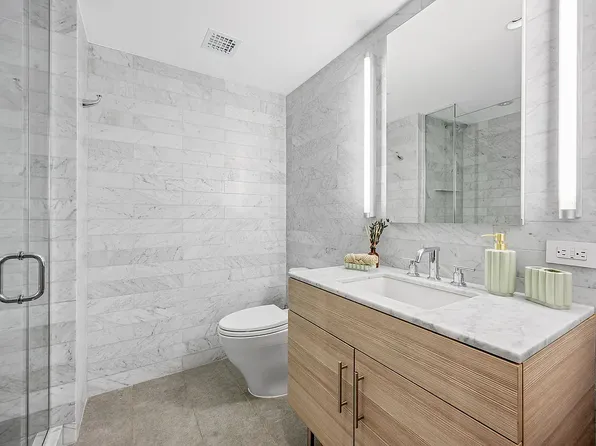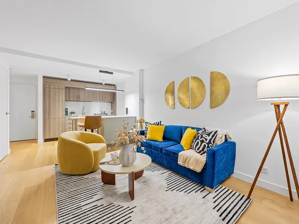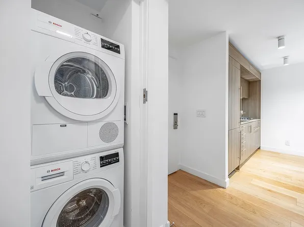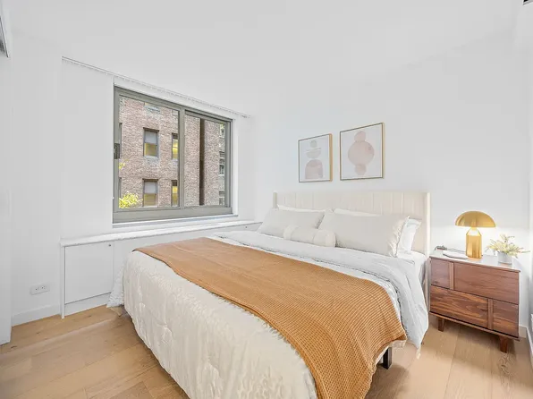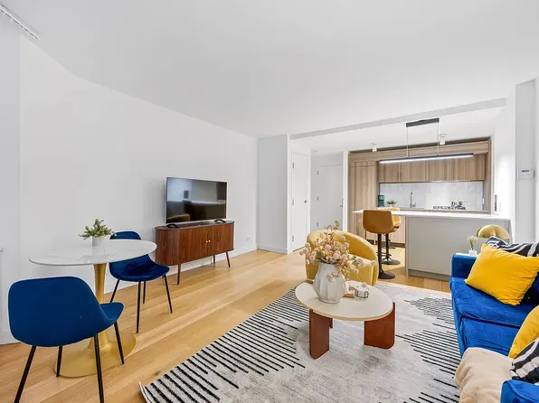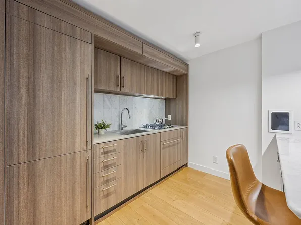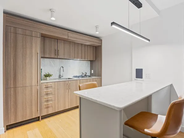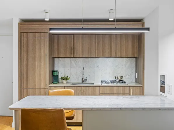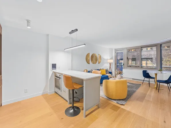 Apartment 14F is a loft-style 1-bedroom, 1-bathroom home with 9-foot ceilings offering a thoughtfully designed living space, filled with natural light from oversized windows that face south over the MoMA gardens on 54th Street. The sleek, modern kitchen features custom Italian cabinetry, Cambria quartz countertops, and a premium Bosch appliance suite, including a gas cooktop (now rare in new construction) with microwave above and oven below.