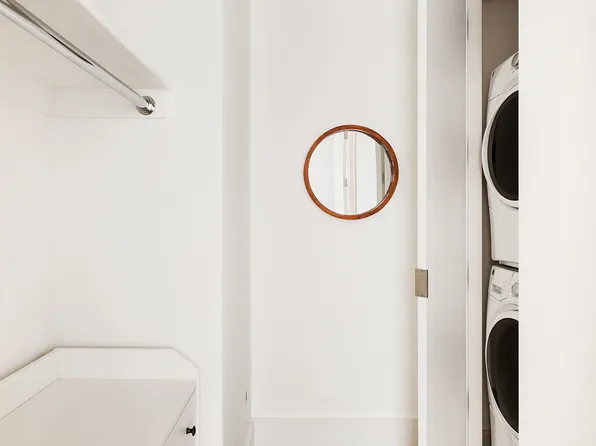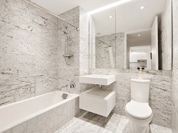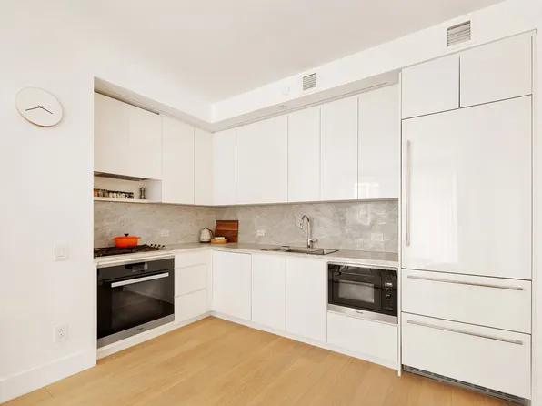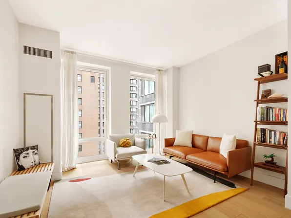 Apartment 9F is a loft-style 1-bedroom, 1-bathroom home with 9-foot ceilings offering a thoughtfully designed living space, filled with natural light from oversized windows that face south over the MoMA gardens on 54th Street. The sleek, modern kitchen features custom Italian cabinetry, Cambria quartz countertops, and a premium Bosch appliance suite, including a gas cooktop (now rare in new construction) with microwave above and oven below.