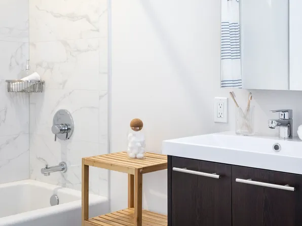 Contrasting against the glistening white walls, dark doors gives this 2 bedroom with 1.5 Bath in Red hook an unforgettable character. An angled half wall and sit in breakfast bar creates flexibility within the spacious living area.