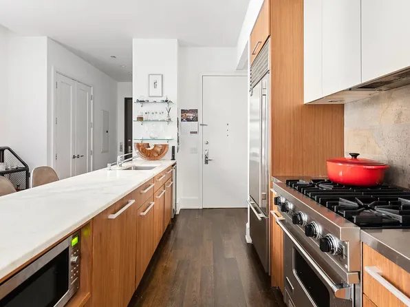The unit is equipped with an open kitchen featuring stainless steel Liebherr appliances and oak-wood floors throughout. The bathroom is elegantly tiled and the apartment features walk closets and an in-unit washer/dryer.