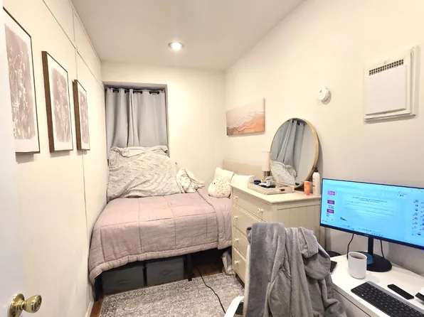 The master bedroom with en suite bath has an exposed brick overlooking a courtyard in the back facing south which keeps the space quiet and bright.
