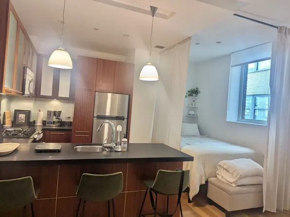 This extra-large studio features a separate sleeping alcove, a pass-through kitchen with stainless steel appliances, and two over-sized windows with open city views. For your convenience, laundry rooms are located on every floor. The use of flex walls or any space alterations are not permitted.