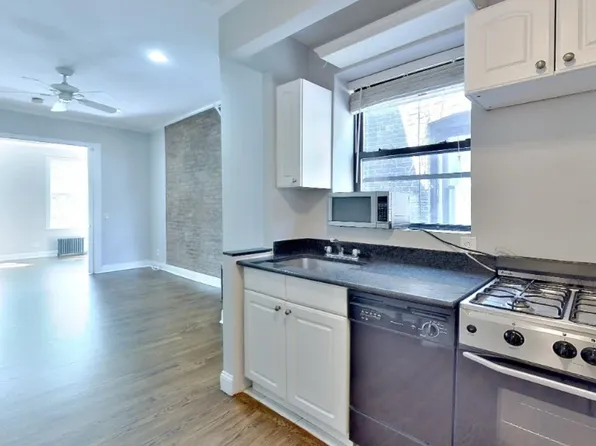 This home seamlessly blends pre-war character with modern upgrades, featuring 9-foot ceilings, herringbone hardwood floors, and a separate newly gut-renovated windowed kitchen finished with white high gloss cabinetry, stainless steel appliances including a dishwasher, stone countertop/backsplash. and grey slate floors.