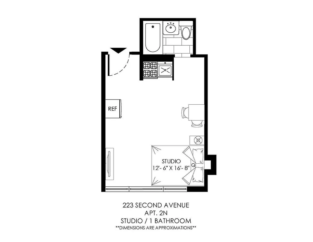 Studio Apartment with white appliances, built-in microwave, and hardwood floors. This unit comes with large windows facing 2nd Avenue. Cozy studio with a step ladder for storage or bedding area. Contact us today for more information and details.