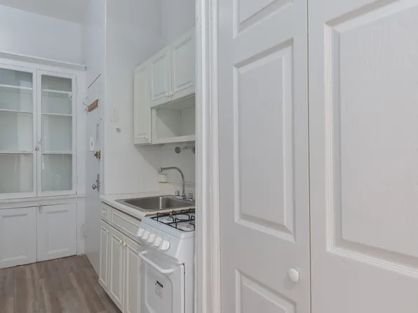 The apartment features a spacious open living room with a decorative fireplace and wall shelving. Large double closest with additional storage space above. A separate windowed kitchen with full size appliances, along with the original built in hutch cabinet. Off the kitchen is a newly tiled bathroom with soaking tub & vanity.