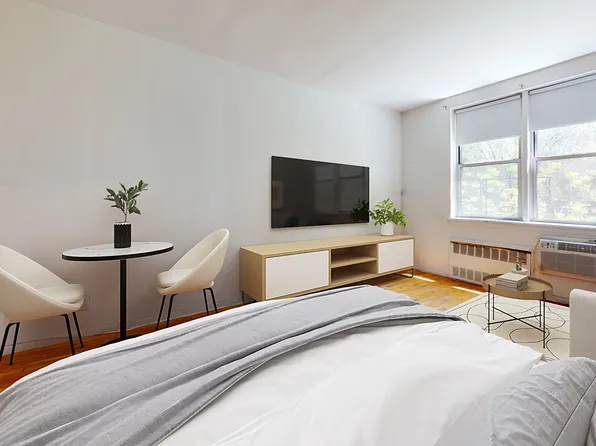 Beautiful alcove studio with a large living area and charming red brick wall.