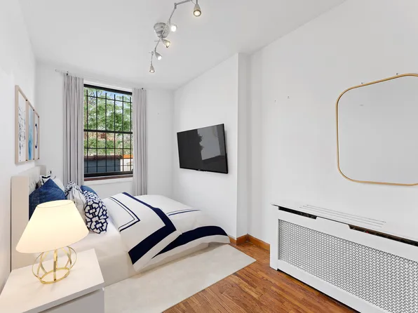 This sun flooded charming two bedroom features a huge living room with plenty of space to entertain and dine, high ceilings, large windows, with unobstructed views, skim coated walls, moldings, & beautiful wood floors, and SPACE.