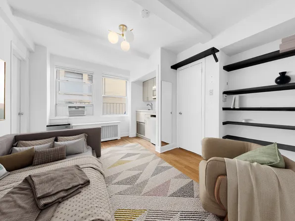 Here's an exclusive chance to own a recently renovated apartment featuring brand-new kitchen cabinets and appliances, including a convection/microwave oven and refrigerator. This cozy space boasts two ample closets for storage, accommodating both your bed and couch comfortably. Witness breathtaking night views with the iconic Empire State Building in sight.