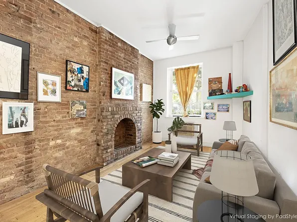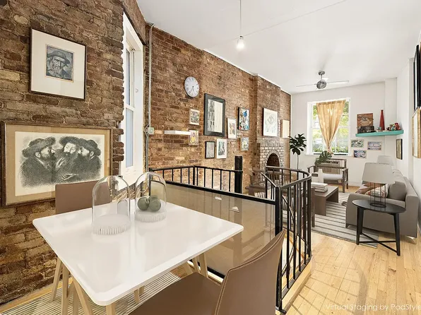 This inviting apartment seamlessly blends timeless pre-war details with thoughtful modern updates. The warm and welcoming living space is anchored by exposed brick and a decorative fireplace, adding rich texture and authentic New York charm.