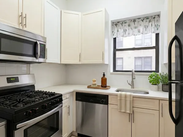 SUN DRENCHED EXTRA LARGE REAL ONE BEDROOM with BRAND NEW GUT RENOVATED w/STAINLESS STEEL FULL SIZED APPLIANCES with CAESARSTONE COUNTERTOPS and tile backsplash with a CLEAN WHITE bathroom that is windowed.