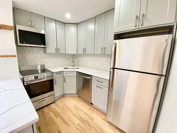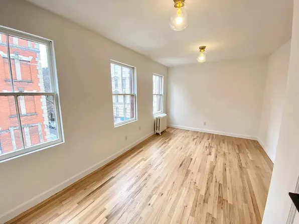 Spacious 1.5BR on 2nd floor of walk-up. Features high ceilings, exposed brick, decorative fireplace, hardwood floors, and separate kitchen with full-size appliances.