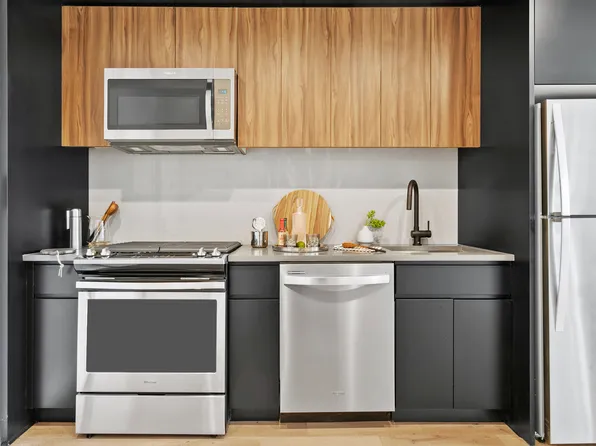 Studio Home with Open Kitchen. Apartments feature modern kitchens with Blomberg appliances, high ceilings, smart-controlled Heating and Cooling Systems.