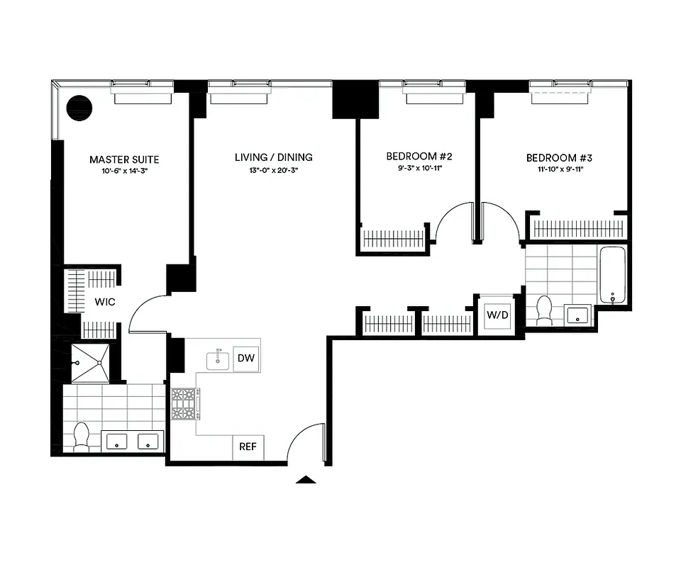 This elegant north-facing three-bedroom residence features an in-unit washer/dryer, white desert oak flooring, floor-to-ceiling windows, solar shades, LED lighting and more.