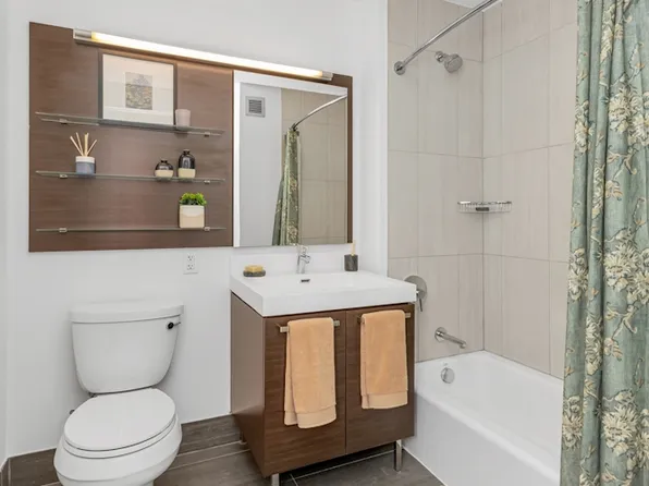 This elegant one-bedroom residence offers south and east views. It features an in-unit washer/dryer, white desert oak flooring, floor-to-ceiling windows, solar shades, LED lighting and more. The kitchen includes a gas range, dishwasher, custom cabinetry, under cabinet lighting and Caesarstone counters, while the bathroom offers a tri-view mirror with storage and custom European vanity.