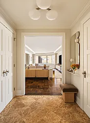 The hallway is bright with beige walls and tiled flooring, flowing into a living room with large windows and warm parquet floors, creating an airy, light-filled path and welcoming gathering space.